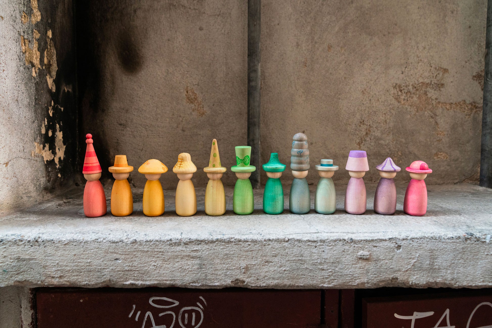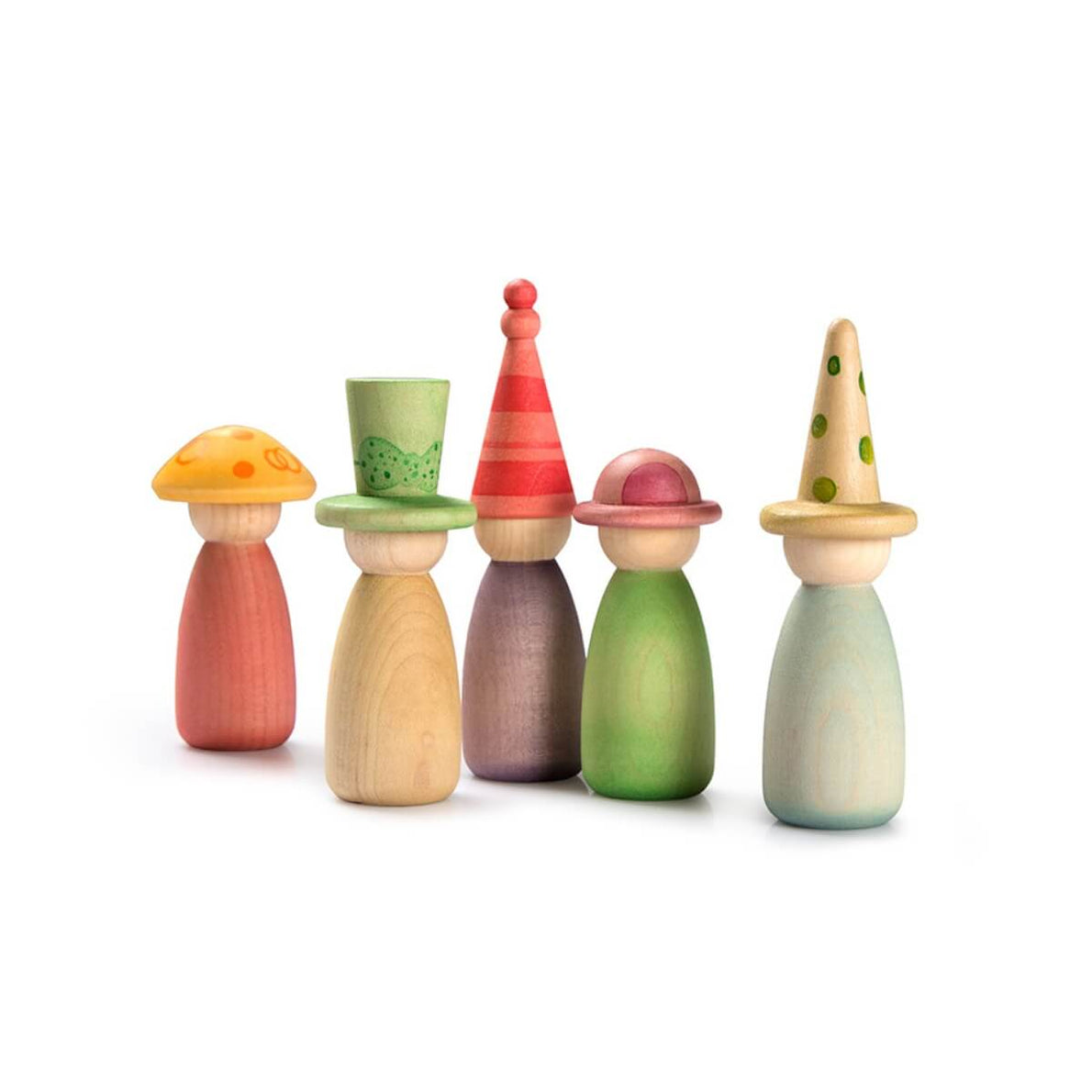 The set contains 12 Nins hand-stained in our 12 signature colours of the rainbow with interchangeable hats and bodies to bring even more combinations of colourful possibilities to every open-ended play activity.