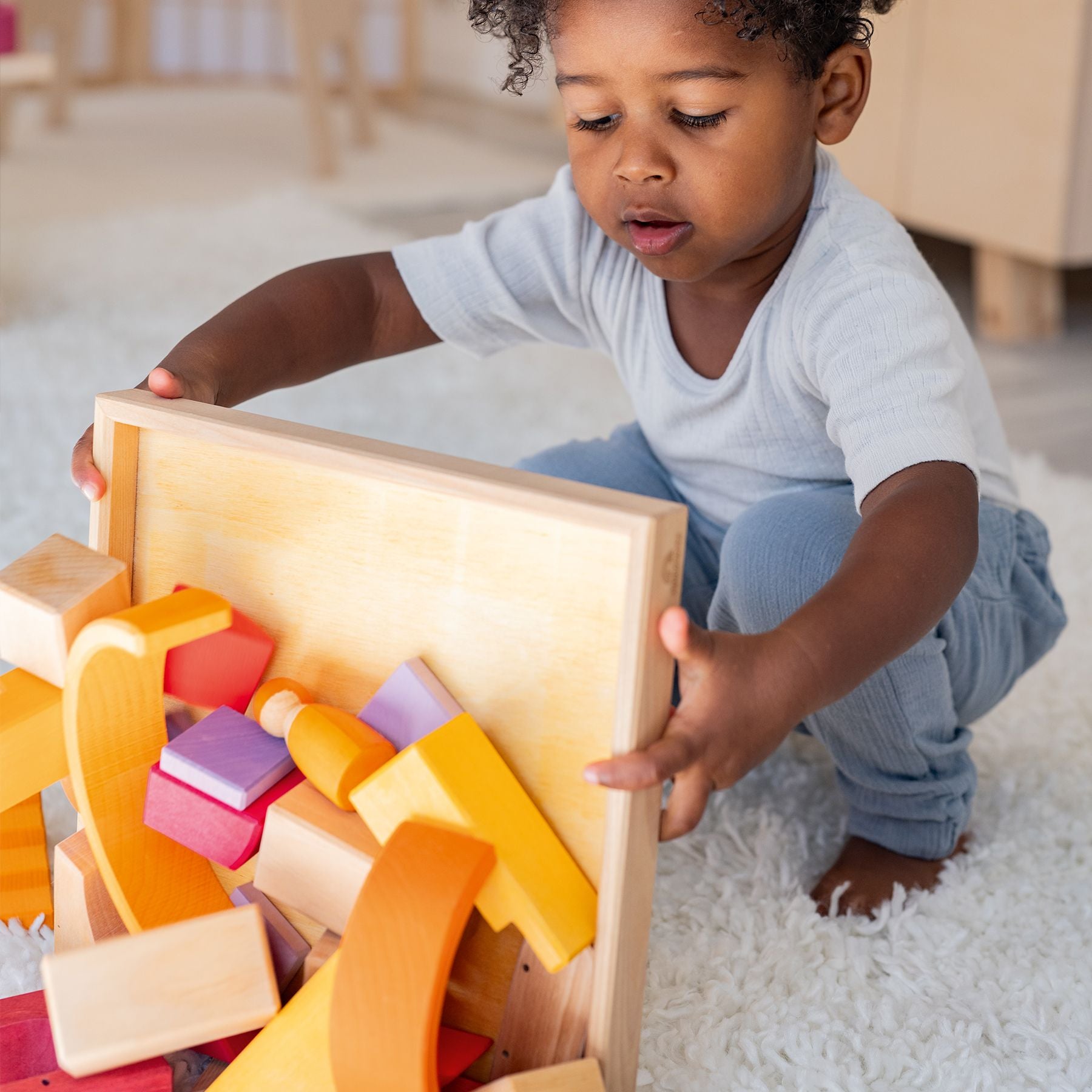Rich yellow, orange and red tones mixed with natural wood give the Grimm's Building World Desert Sand a deep warmth. The building materials come in a wide variety of shapes allowing imaginative free building and will complement the GRIMM'S assortment with their wonderful details, such as the special robes of the two friends and a mountable, movable door.