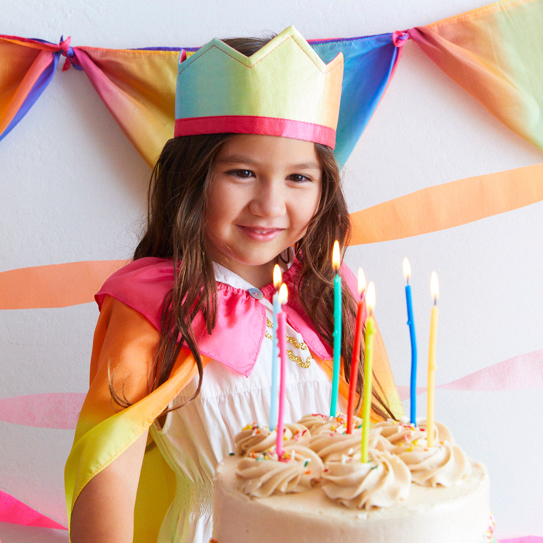Sarah's Silks Crowns are shiny, beautiful, and fit comfortably! The elastic back allows them to stretch to fit most head sizes. Hand-painted on luminously textured jacquard silk in our most beloved colorways. Children will love incorporating crowns into daily dress-up and imaginative play, plus they're perfect for birthdays and other celebrations!